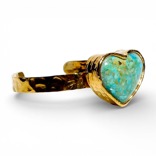 Green Turquoise Heart Hammered Gold Cuff Bracelet