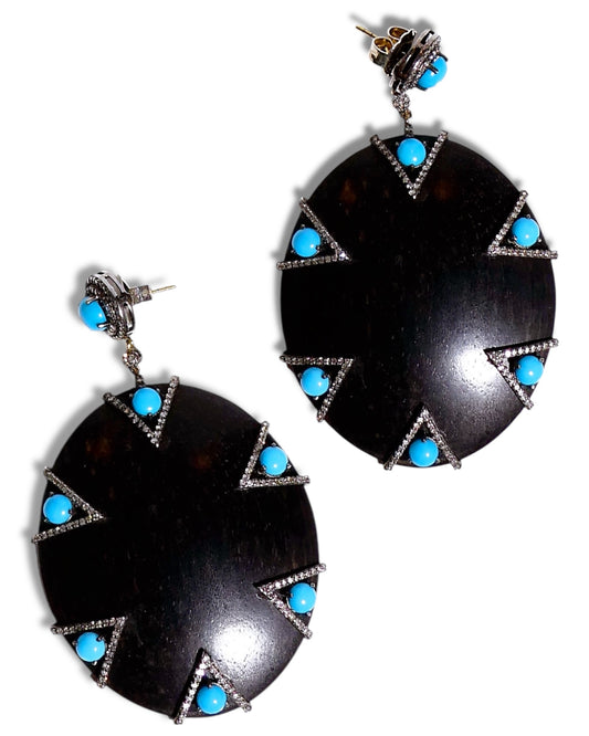 Wooden Drop Earrings with Turquoise and Black Diamonds