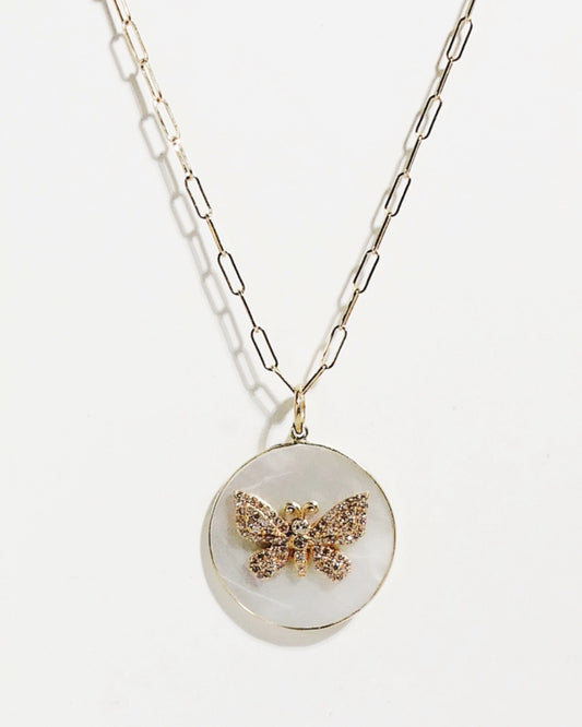 14K Gold Diamond pave Butterfly on Mother of Pearl Pendent
