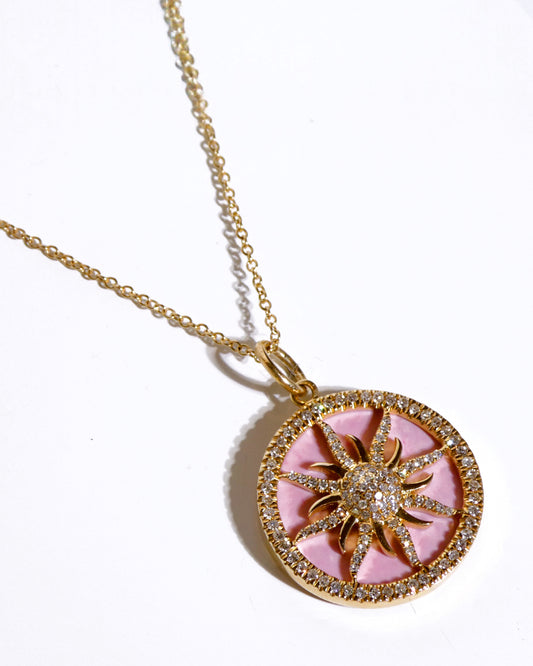 Diamond Sunburst Pendent in 14k Gold and Pink Enamel
