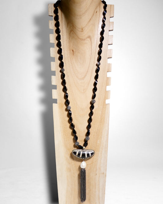 Long Black Gemstone Beaded Tassel Necklace with Crescent Tribal Centerpiece