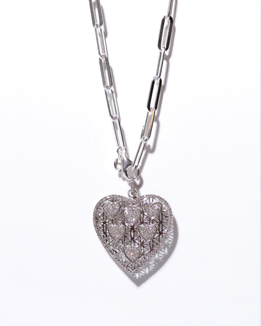 Pave Diamond Filigree Heart on Paperclip Chain Necklace