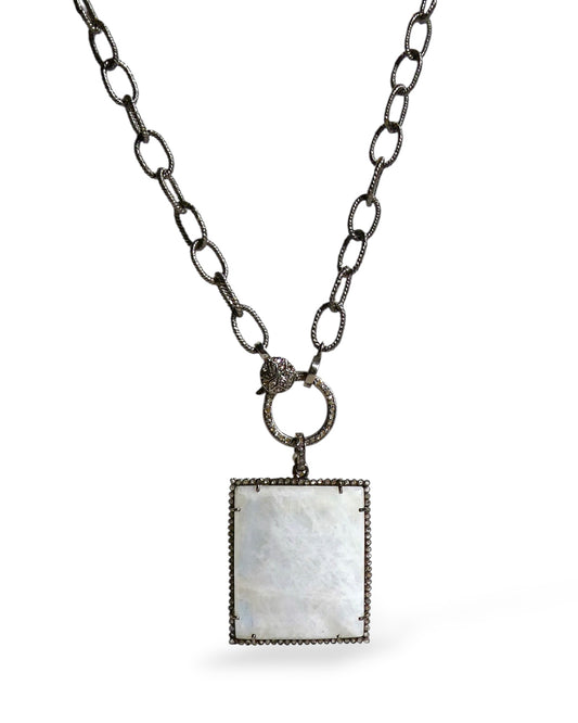 Square Rainbow Moonstone Pendant with Pavé Black Diamonds
