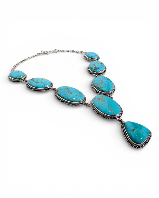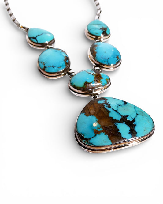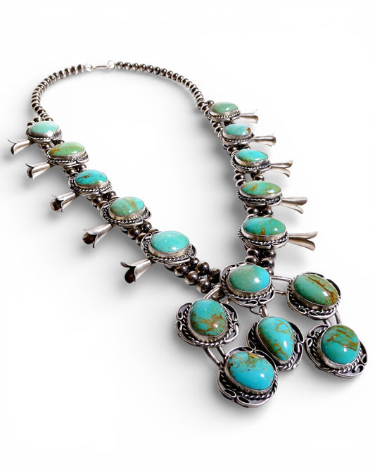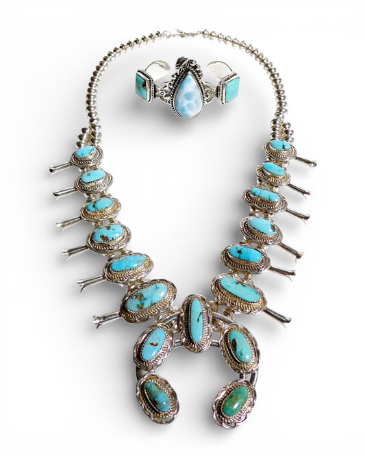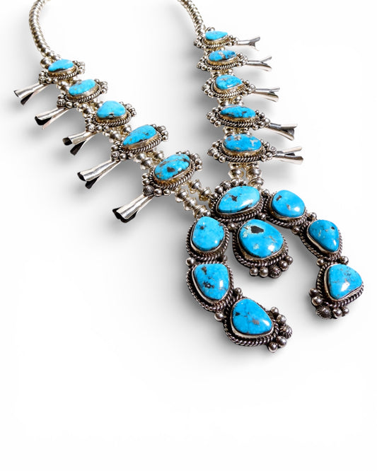 Bright Blue Turquoise Squash Blossom Necklace in Sterling Silver