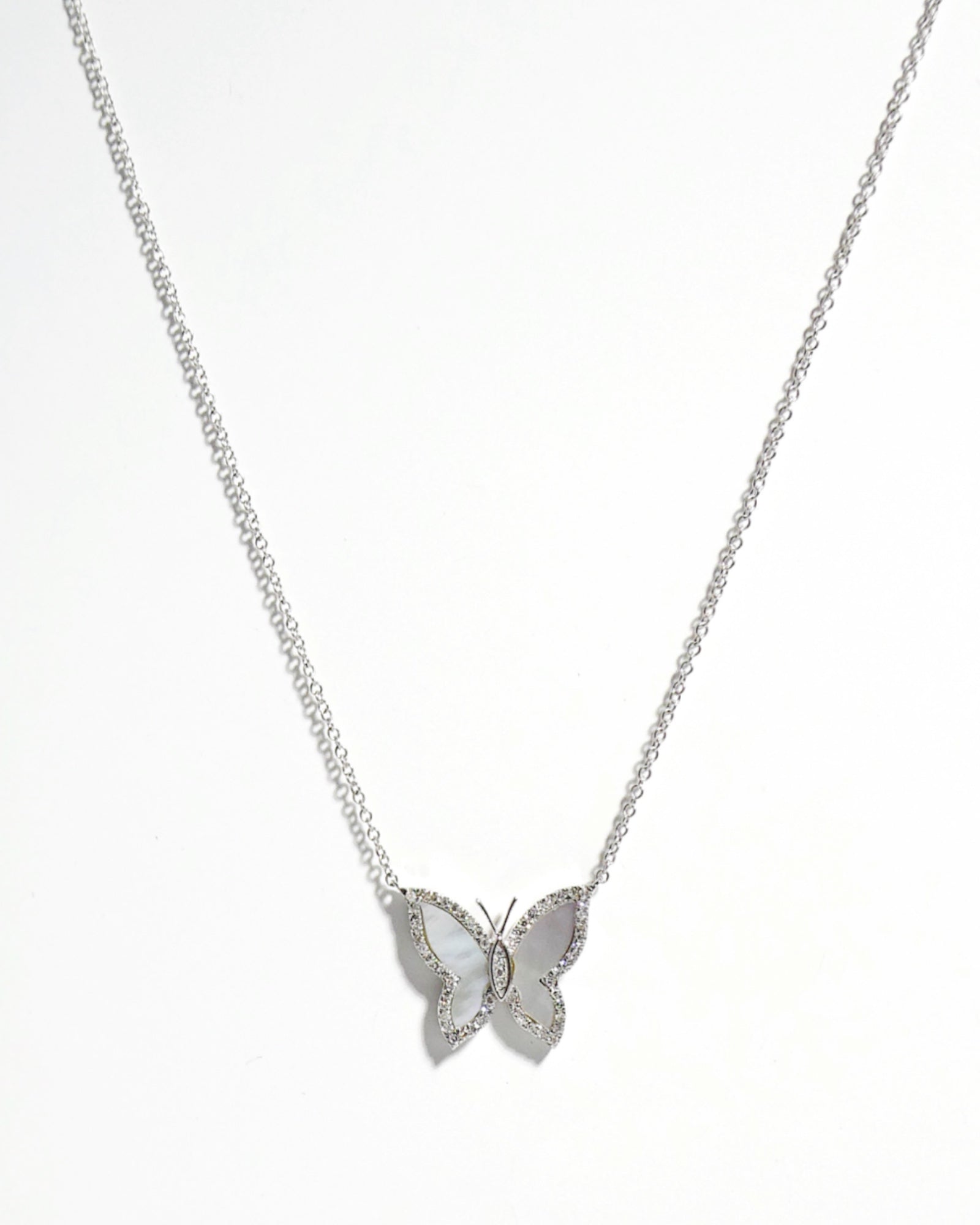 14k White Gold Mother of Pearl & Diamond Butterfly Necklace